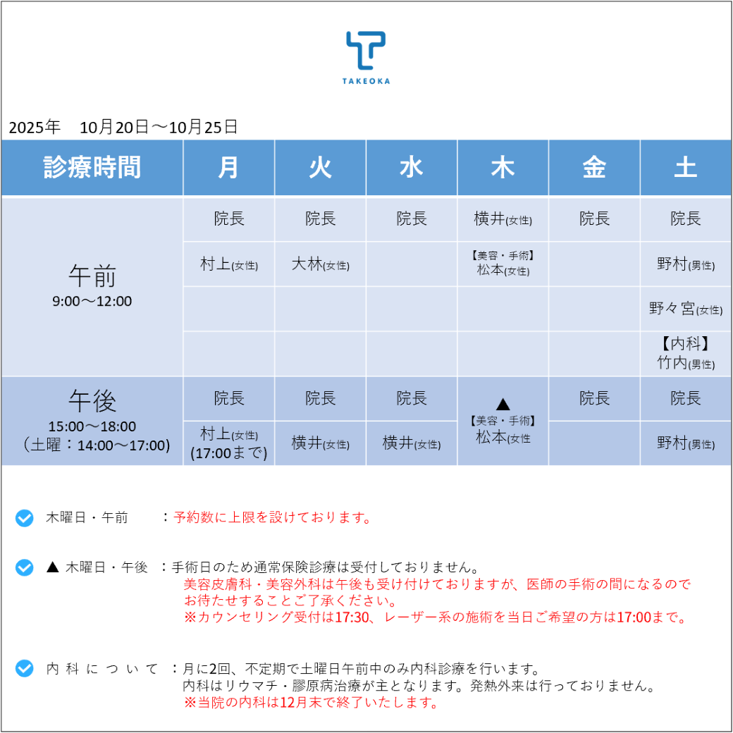 ※木曜日の午後は、手術日のため通常保険診療は受付しておりません。美容皮膚科・美容外科は、17:30まで受け付けております。レーザー系の施術は、17:00までにお越しください。医師の手術の間になりますのでお待たせすること何卒ご了承くださいますようお願い申し上げます。