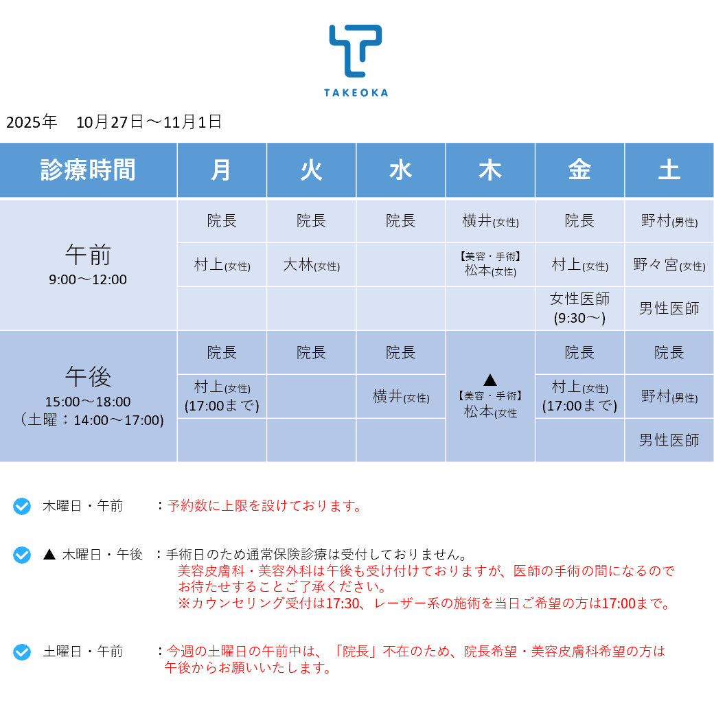 ※木曜日の午後は、手術日のため通常保険診療は受付しておりません。美容皮膚科・美容外科は、17:30まで受け付けております。レーザー系の施術は、17:00までにお越しください。医師の手術の間になりますのでお待たせすること何卒ご了承くださいますようお願い申し上げます。