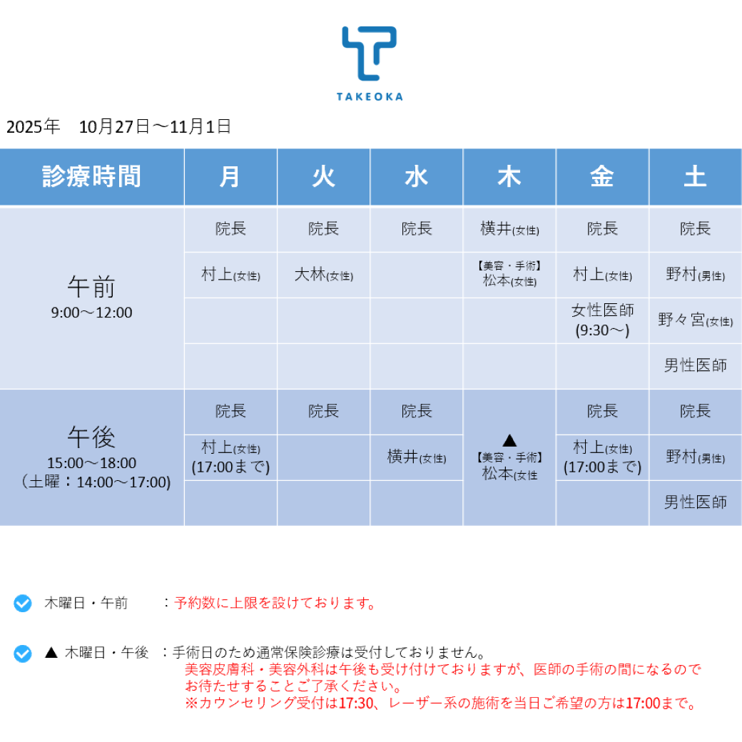 ※木曜日の午後は、手術日のため通常保険診療は受付しておりません。美容皮膚科・美容外科は、17:30まで受け付けております。レーザー系の施術は、17:00までにお越しください。医師の手術の間になりますのでお待たせすること何卒ご了承くださいますようお願い申し上げます。