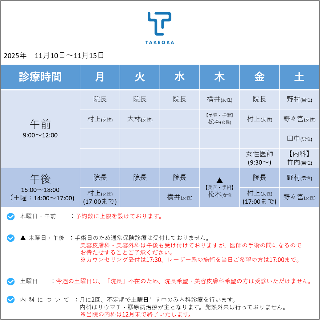 ※木曜日の午後は、手術日のため通常保険診療は受付しておりません。美容皮膚科・美容外科は、17:30まで受け付けております。レーザー系の施術は、17:00までにお越しください。医師の手術の間になりますのでお待たせすること何卒ご了承くださいますようお願い申し上げます。