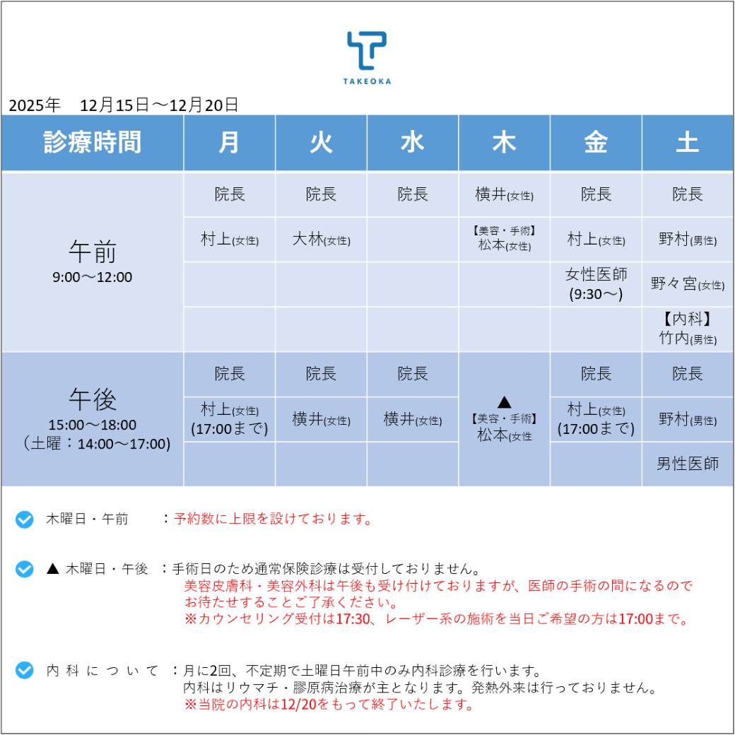 ※木曜日の午後は、手術日のため通常保険診療は受付しておりません。美容皮膚科・美容外科は、17:30まで受け付けております。レーザー系の施術は、17:00までにお越しください。医師の手術の間になりますのでお待たせすること何卒ご了承くださいますようお願い申し上げます。