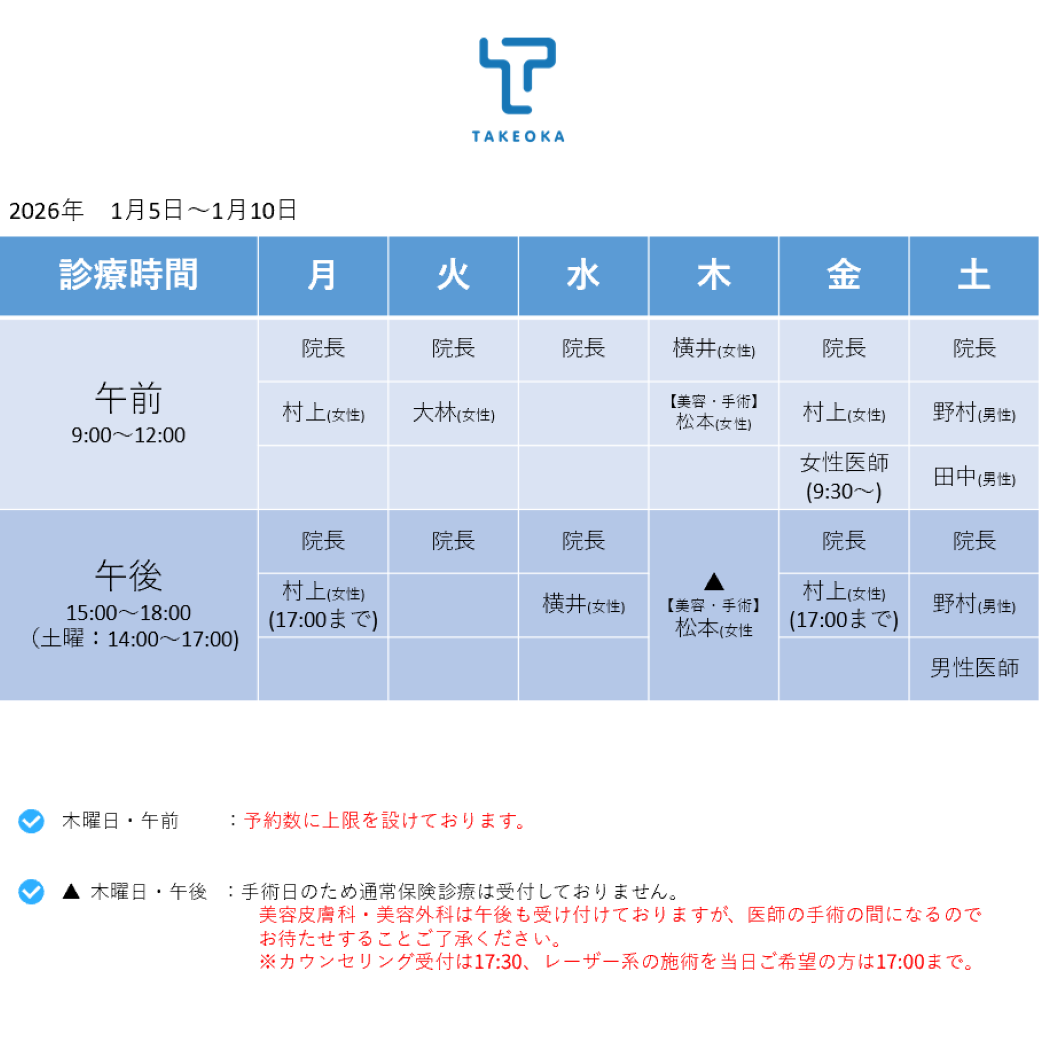 ※木曜日の午後は、手術日のため通常保険診療は受付しておりません。美容皮膚科・美容外科は、17:30まで受け付けております。レーザー系の施術は、17:00までにお越しください。医師の手術の間になりますのでお待たせすること何卒ご了承くださいますようお願い申し上げます。