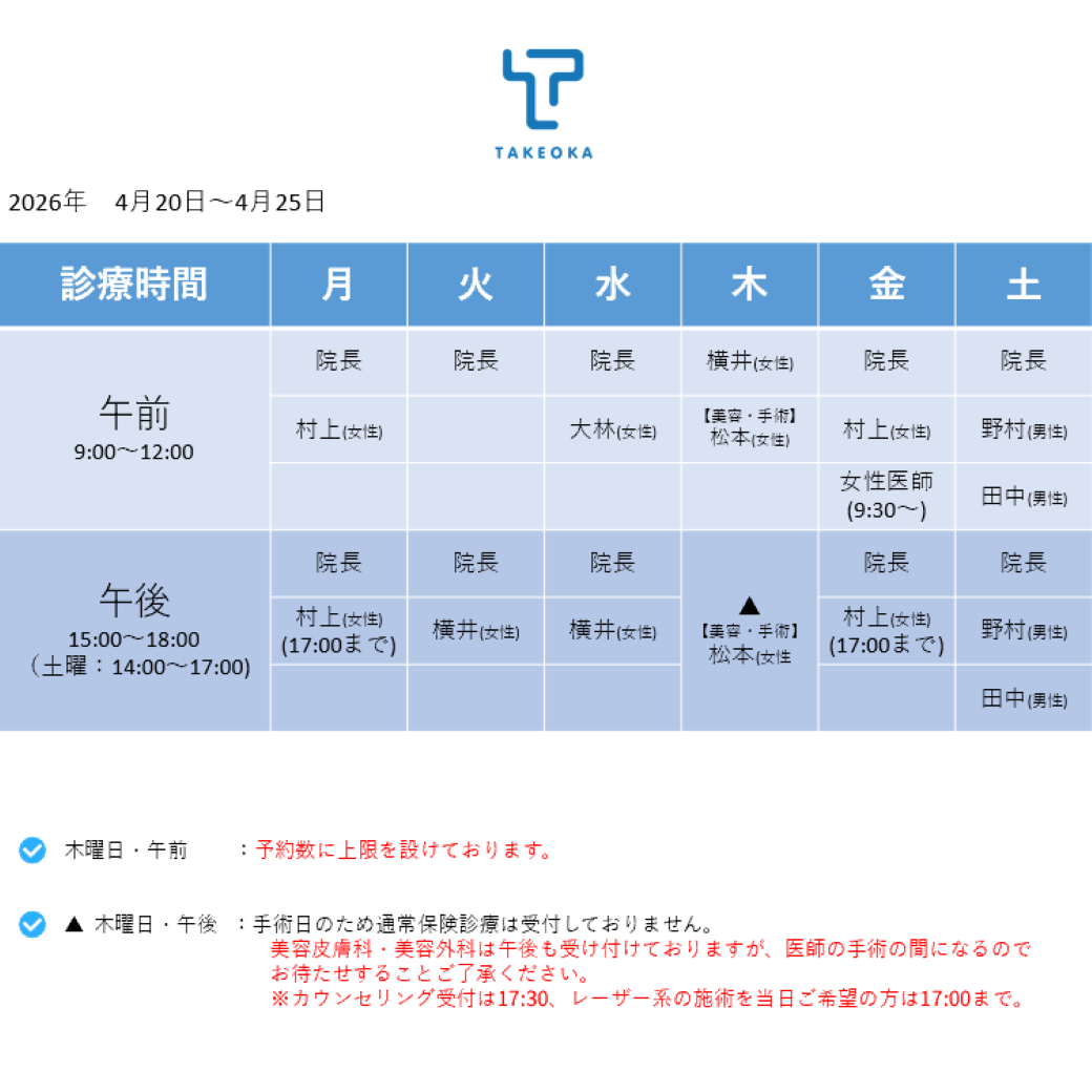 ※木曜日の午後は、手術日のため通常保険診療は受付しておりません。美容皮膚科・美容外科は、17:30まで受け付けております。レーザー系の施術は、17:00までにお越しください。医師の手術の間になりますのでお待たせすること何卒ご了承くださいますようお願い申し上げます。