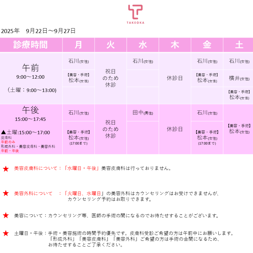 ※毎週、診療担当医により美容皮膚科・美容外科のカウンセリング・施術を受けられる曜日が異なります。詳細はWEBのお知らせ、またはWEB受付ページをご確認ください。