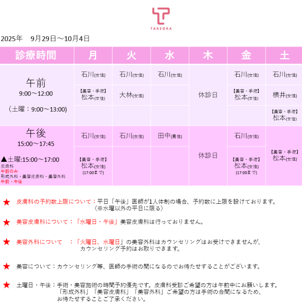 ※毎週、診療担当医により美容皮膚科・美容外科のカウンセリング・施術を受けられる曜日が異なります。詳細はWEBのお知らせ、またはWEB受付ページをご確認ください。