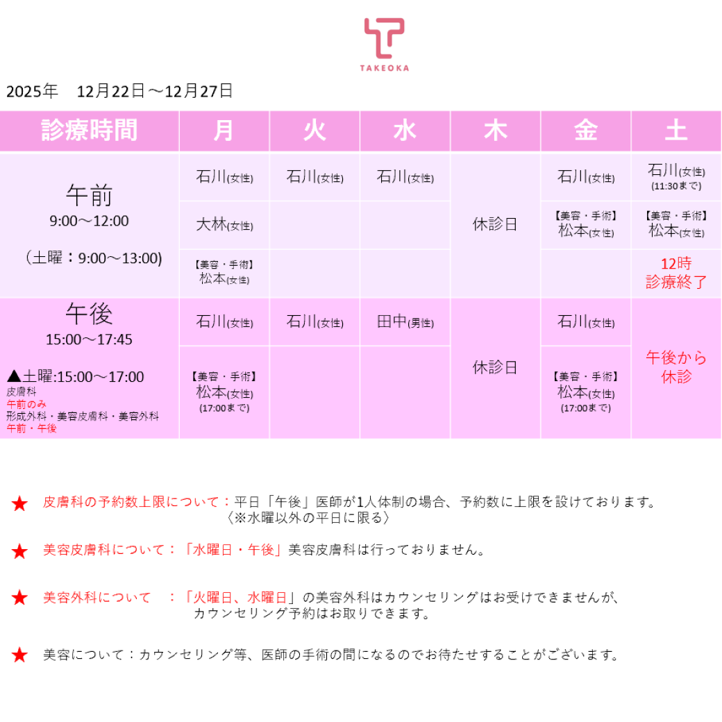 12/22(月)〜12/27(土)の担当医