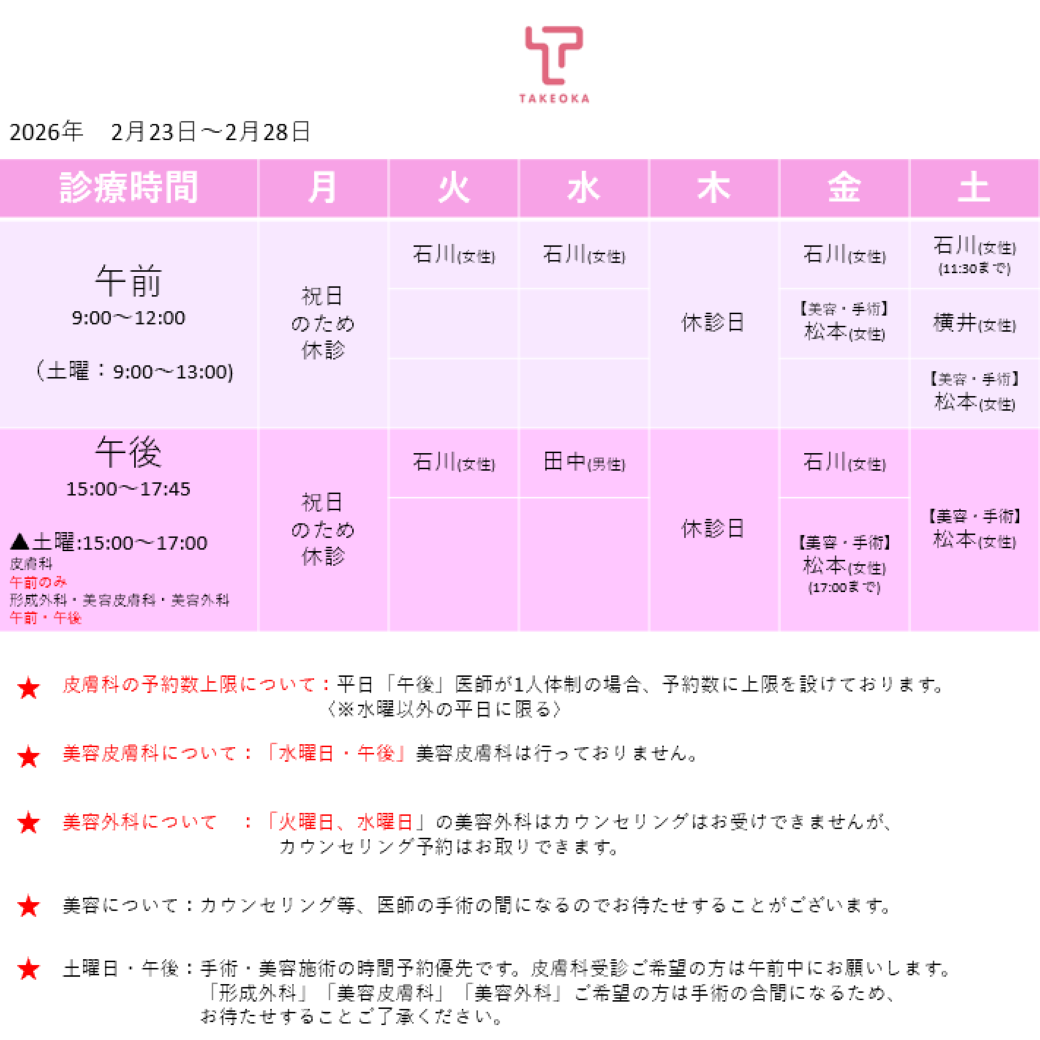 ※毎週、診療担当医により美容皮膚科・美容外科のカウンセリング・施術を受けられる曜日が異なります。詳細はWEBのお知らせ、またはWEB受付ページをご確認ください。